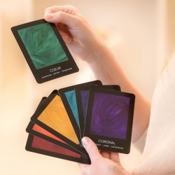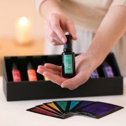 Le coffret se compose des 7 parfums chakras en format 30ml dans un écrin de carton noir, fabriqué à la main par une entreprise locale. Il est accompagné d'une pochette, soigneusement rangée à l'arrière des flacons, qui contient un guide d'accompagnement ainsi qu'un oracle réalisé par nos soins et imprimé auprès d'une imprimerie locale.